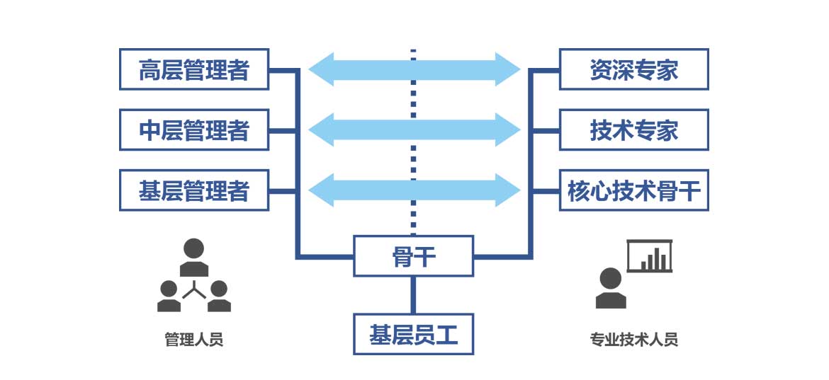 职业发展以公司发展需求为基础,结合员工职业发展的兴趣,为员工提供了专业技术和综合管理职业发展双通道,员工根据自身优势与兴趣,可以选择通过对团队的有效管理,不断扩大管理范围,成为部门和企业的领导,也可以选择潜心于专业技术或某专业领域,发展成为技术专家或某专业领域的专家。两个通道可以交替发展,为员工提供更广阔的职业发展空间。